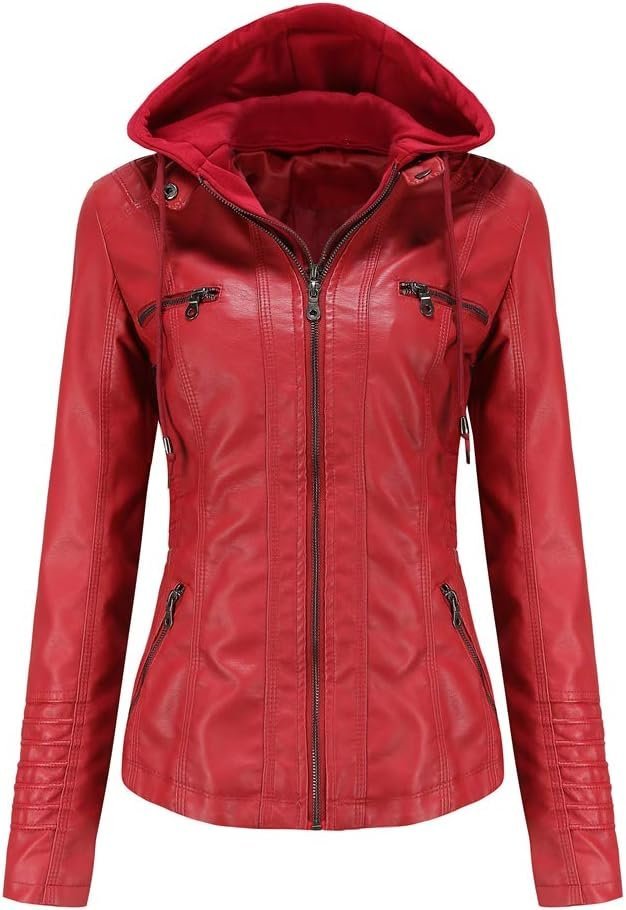 Women’s Stylish Red Faux Leather Jacket with Hood & Zipper Pockets