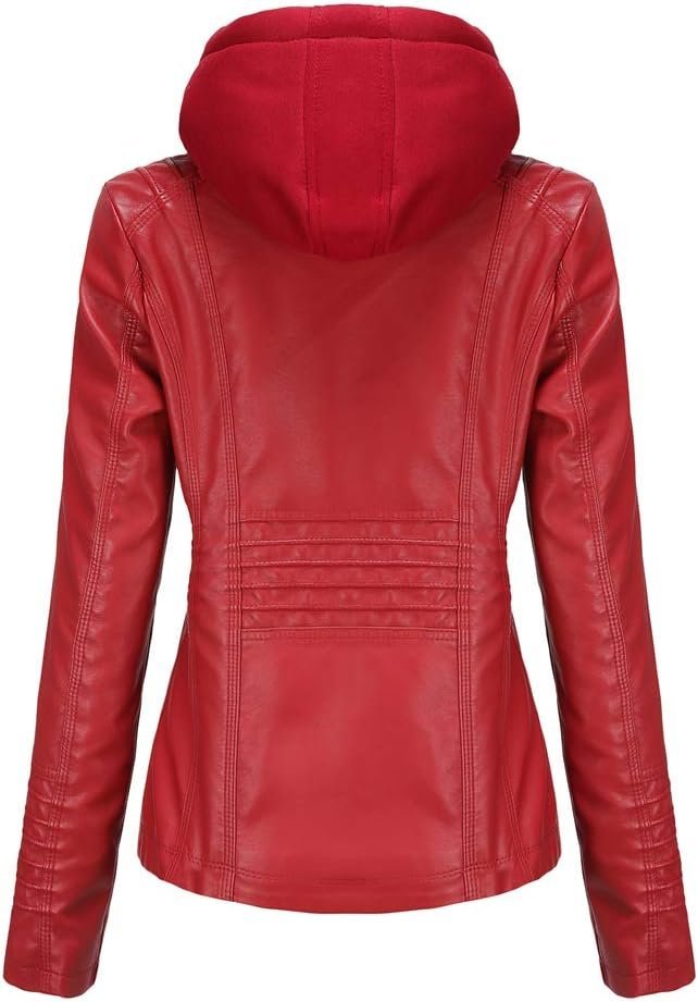 • Two in One: Red leather jacket women with a removal knit hood and front panel with exposed zipper. Can be worn as a standing collar jacket.